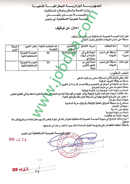 مناصب إدارية للتوظيف في مستشفى بن باديس سيدي بلعباس المدونـــة الجزائريـــــة للتوظيف
